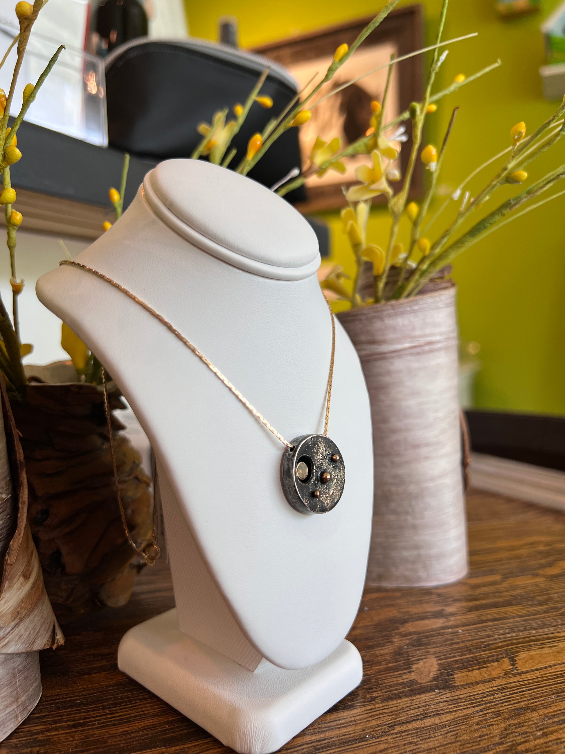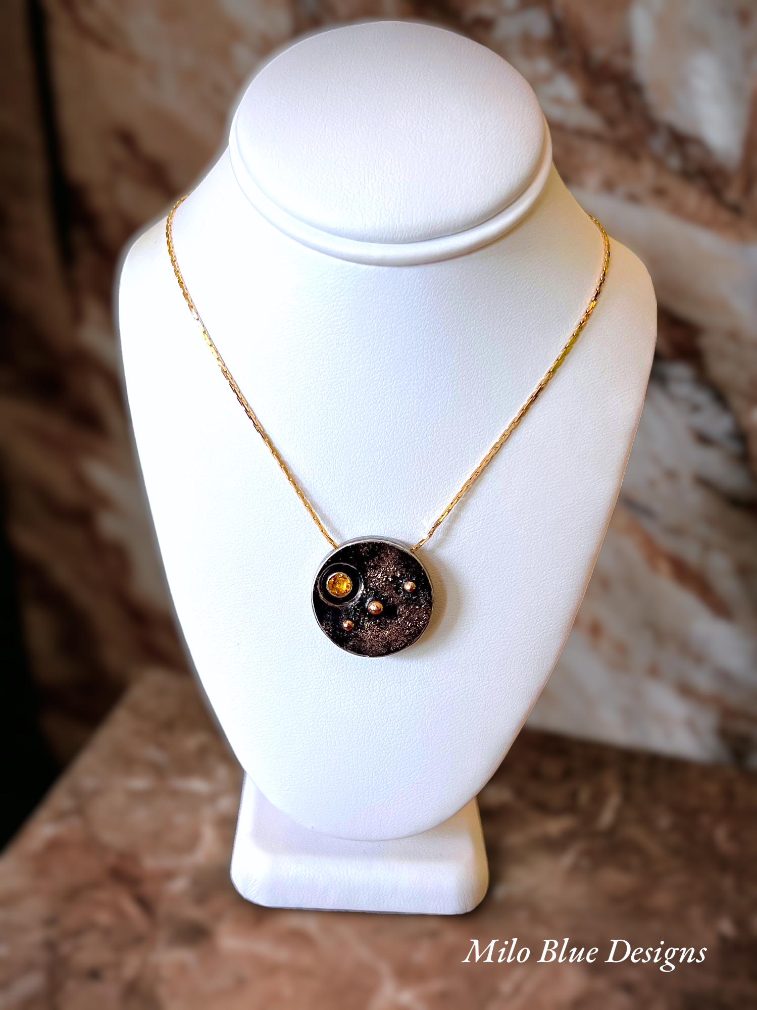 This Gold Galaxy Necklace is an exquisite combination of molten sterling silver which has been oxidized to resemble a night sky, solid 18k gold accent balls, and 18k fused gold stardust, embedded with sparkling citrine for a truly celestial look. A timeless treasure that transports you to the skies. A 14k gold chain goes through the pendant.